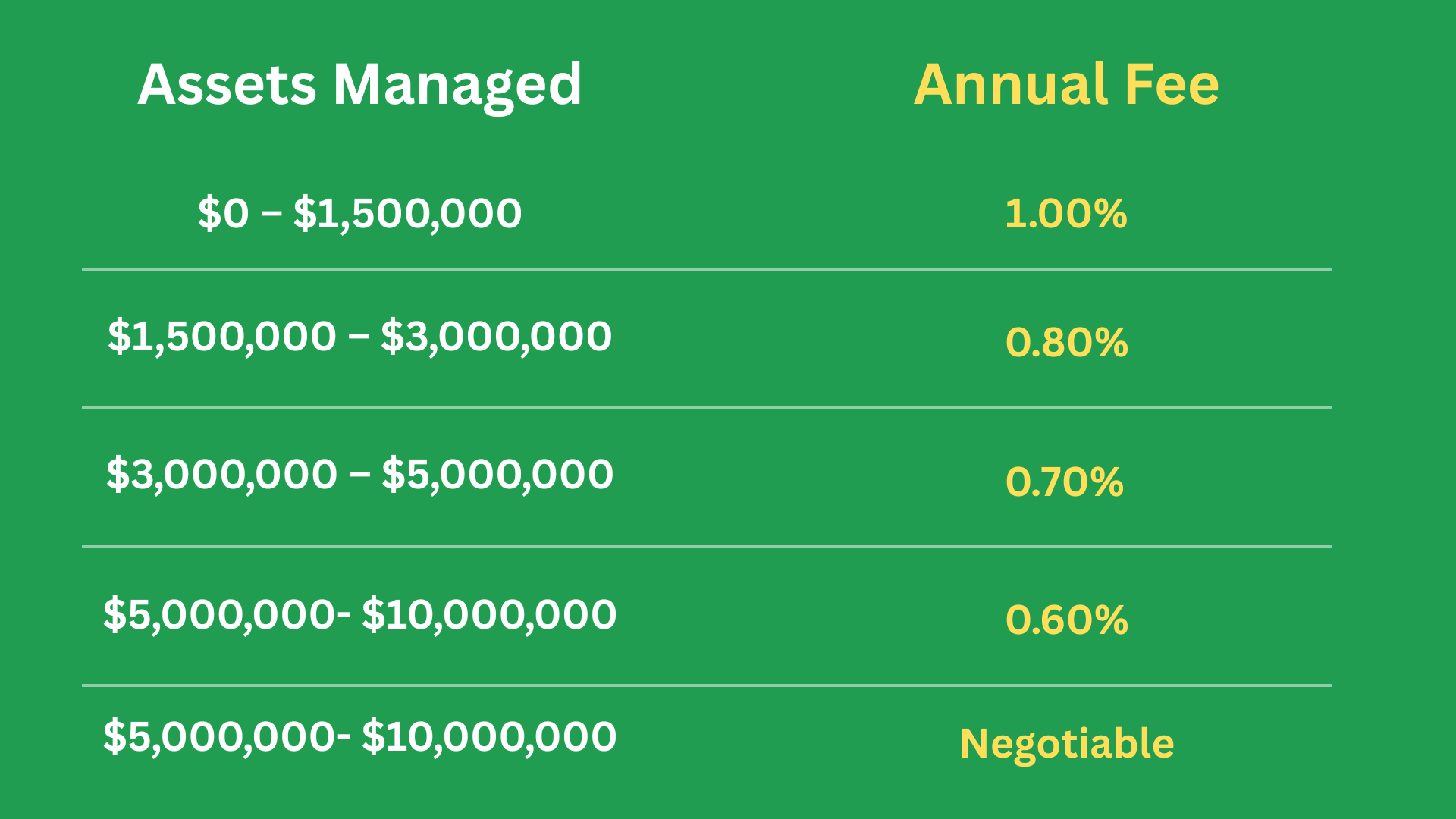 Goes down in price with more assets managed, based on annual value, billed monthly. Investments for all types of accounts using modern, low cost ETFs and strategies. Planning Fee is waived after $500,000 of AUM